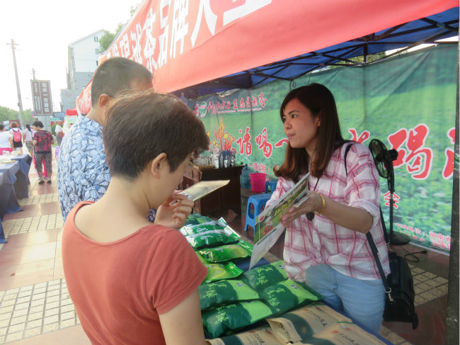 主办方工作人员向市民介绍潇湘·干发碣滩茶活动内容