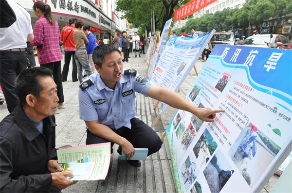 “人和车辆尽量不要冒险涉水前行,不要在山崖、低洼带和高墙下避雨,发现高压线铁塔倾斜时,一定要迅速远离。”县水利局水政监察大队副队长姜小辉在给过往行人宣讲山洪暴发时的注意事项。当天,他们通过发放宣传资料、设立宣传展板和现场解答咨询等方式对公众宣传怎样才能减少山洪灾害、抗旱救灾征用的条件、从事河道采砂的单位和个人必须遵守哪些规定等安全常识,向公众传播涉水安全生产新理念,发放宣传资料2000余份,设立展板5块,接受咨询100余人。