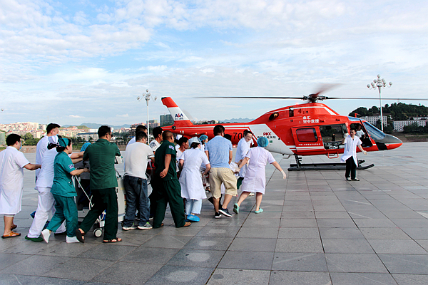 6月27日16:47分,沅陵龙舟广场飞来一架医疗救援直升机,一位因车祸致严重外伤的患者由空中救援直升机从沅陵转往长沙。这是沅陵首位通过远程会诊实行空中转运的患者,实现了沅陵县人民医院空中、陆地120急救的高效链接。