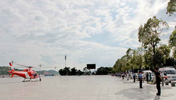 下午16点47分,直升机降落在沅陵龙舟广场,为保证救治生命的绿色通道畅通无阻,沅陵公安派公安干警维持秩序。