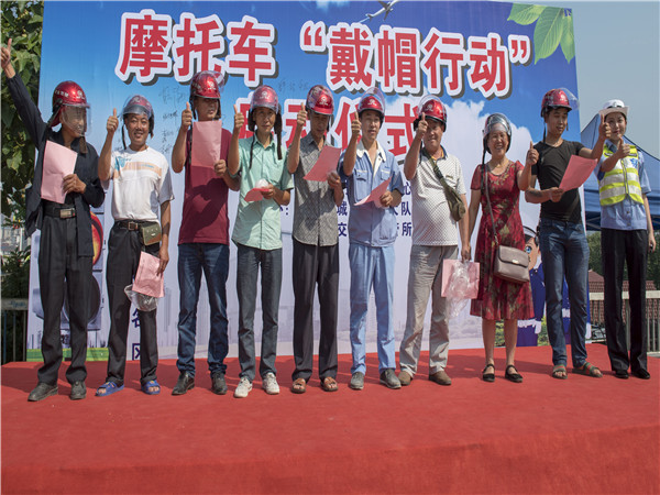 6月15日为全国安全生产主题咨询日,沅陵交警部门联合县运管、城管按照省市道安委关于摩托车“戴帽行动”、县文明卫生创建活动部署,开展免费发放摩托车头盔活动,活动现场领取头盔的摩托车驾驶人竖起高高的大拇指。