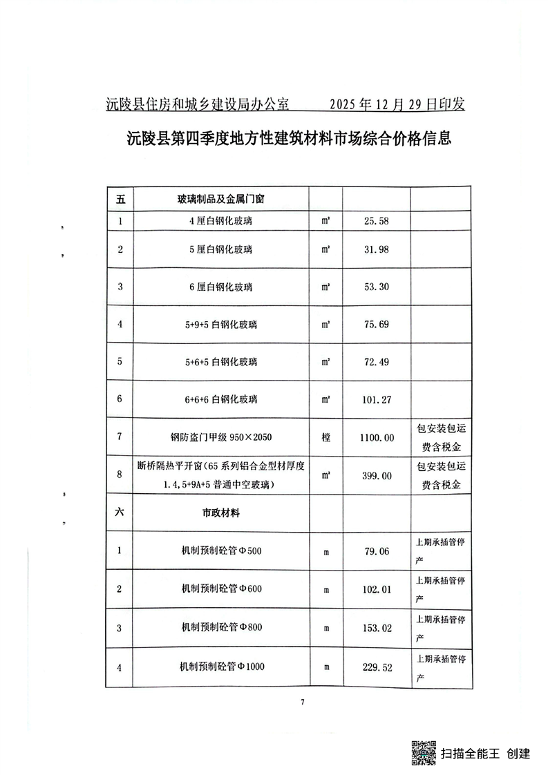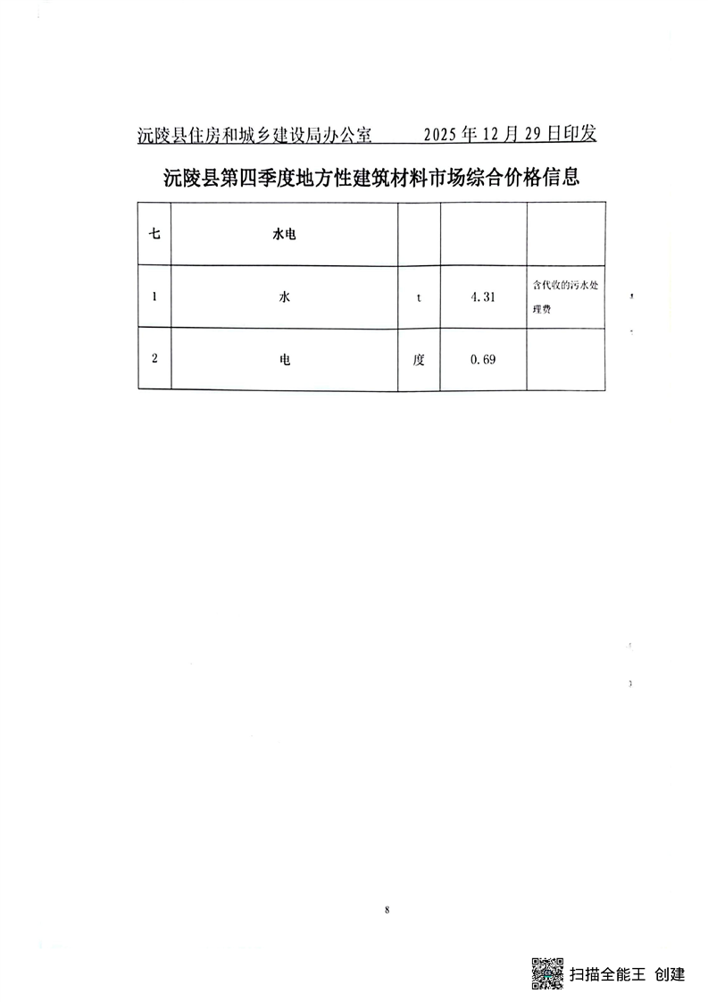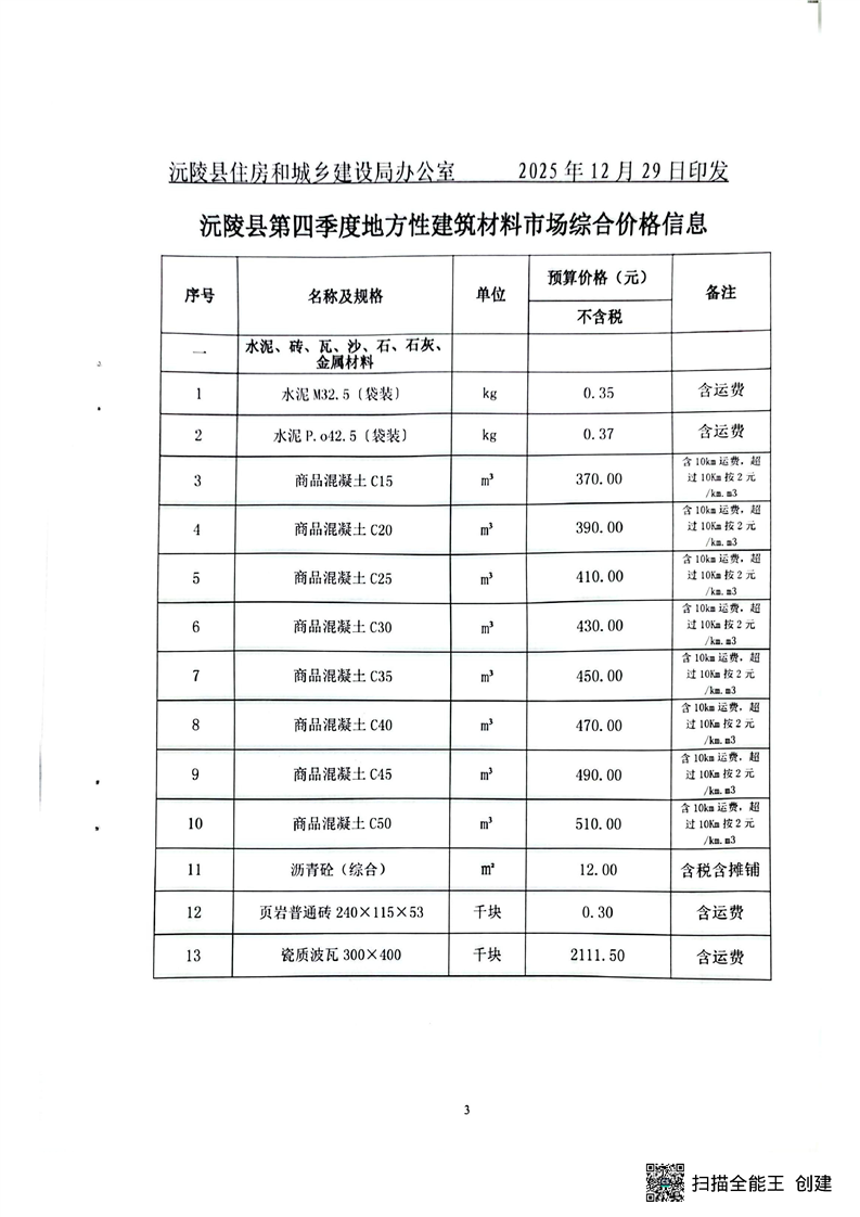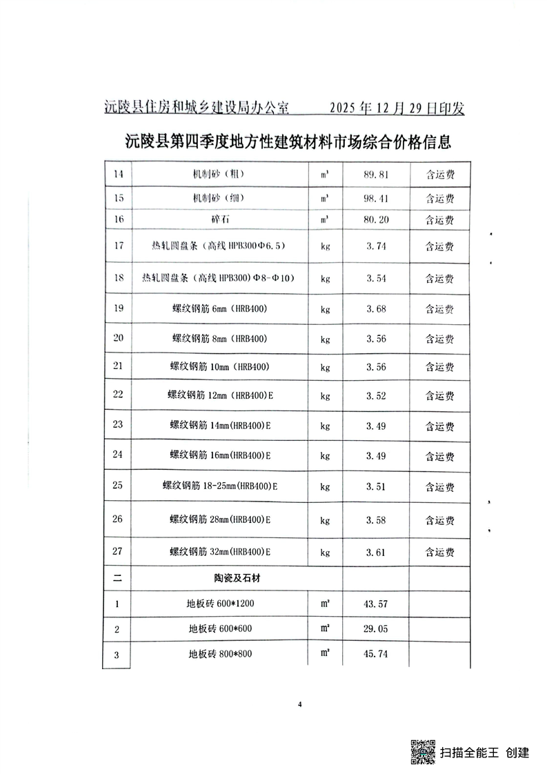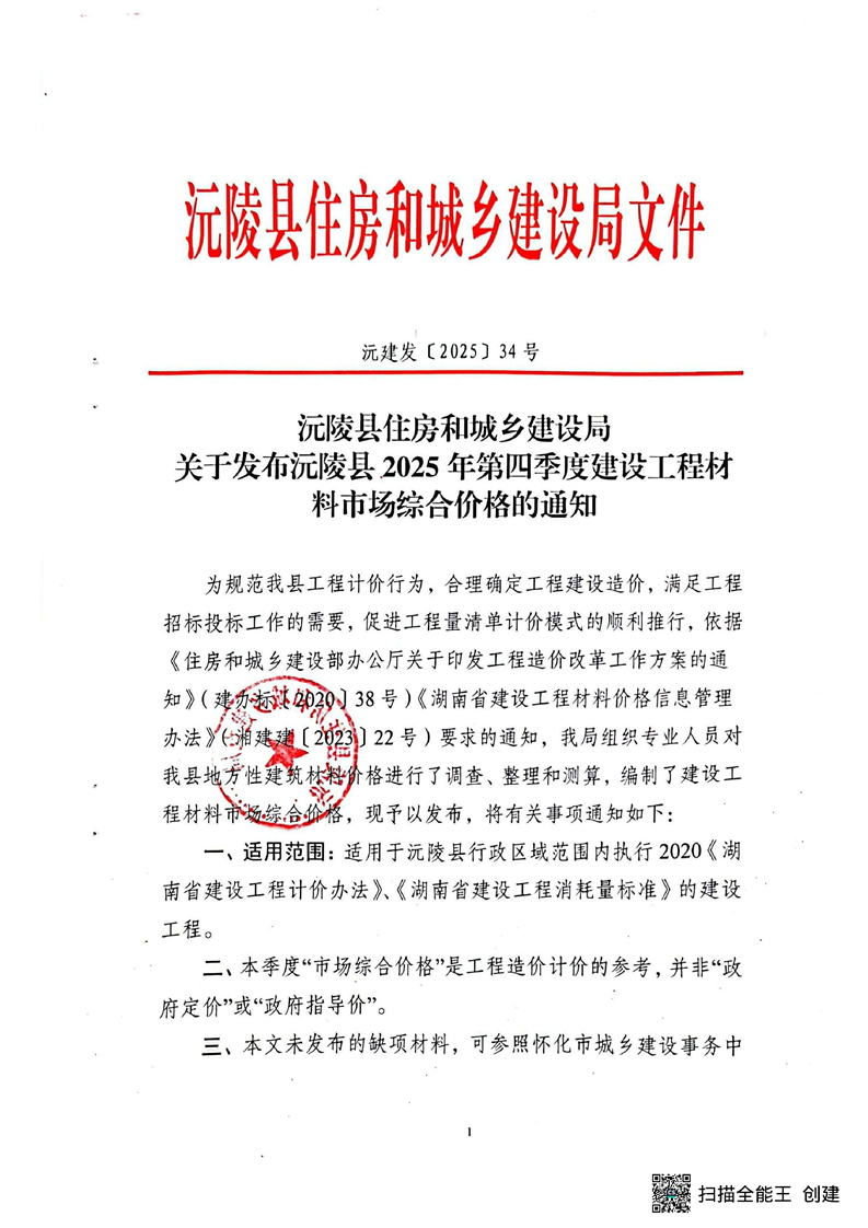 沅陵县住房和城乡建设局关于发布沅陵县2025年第四季度建设工程材料市场综合价格的通知
