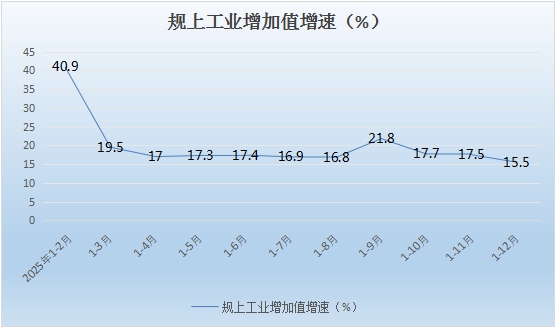 一、工业发展动能充沛,制造业扛起压舱石重任。1-12月,面对高基数承压局面,工业经济稳步前行,达成平稳较快增长目标,规模工业增加值同比增长15.5%,较全市平均水平快7.6个百分点。制造业扛起经济压舱石重任,引领发展的标杆作用愈发显著,全县制造业占工业增加值总量比重达72.21%,制造业增加值同比增长10.2%,对全县经济增长的贡献率为37.8%,拉动经济增长2.4个百分点。重点行业提质增效、表现突出,新动能加速集聚迸发,其中有色金属矿采选业与有色金属冶炼和压延加工业成为核心增长极,两者增加值分别同比增长64.06%,40.59%,持续为工业经济增长提供强劲支撑。
