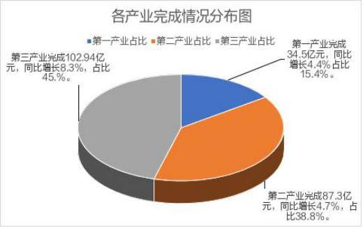 初步核算,全年全县地区生产总值完成224.74亿元,按不变价格计算,同比增长6.3%。从三次产业看,第一产业增加值34.50亿元、增长4.4%;第二产业增加值87.30亿元、增长4.7%;第三产业增加值102.94亿元、增长8.3%。三次产业结构从去年同期的13.9:42.6:43.5调整为15.4:38.8:45.8。