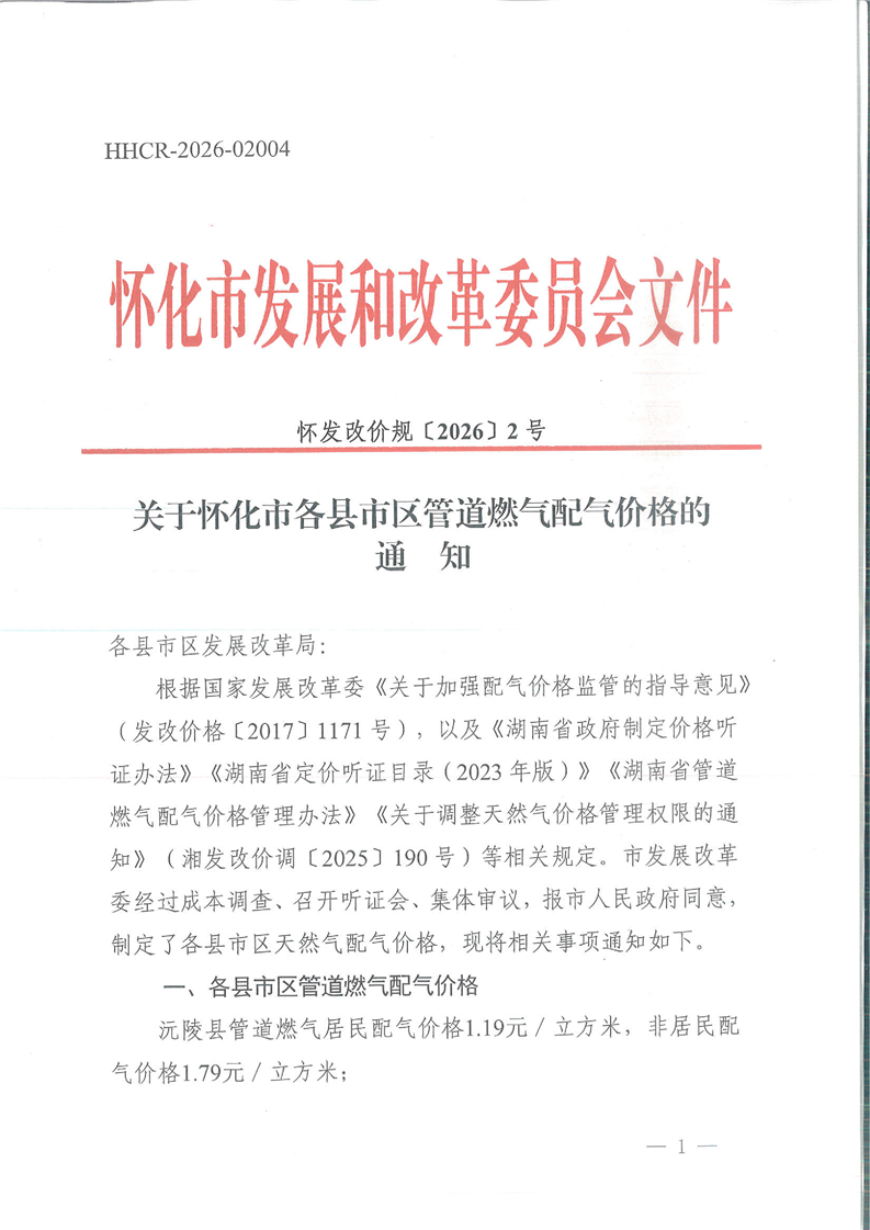 关于怀化市各县市区管道燃气配气价格的通知