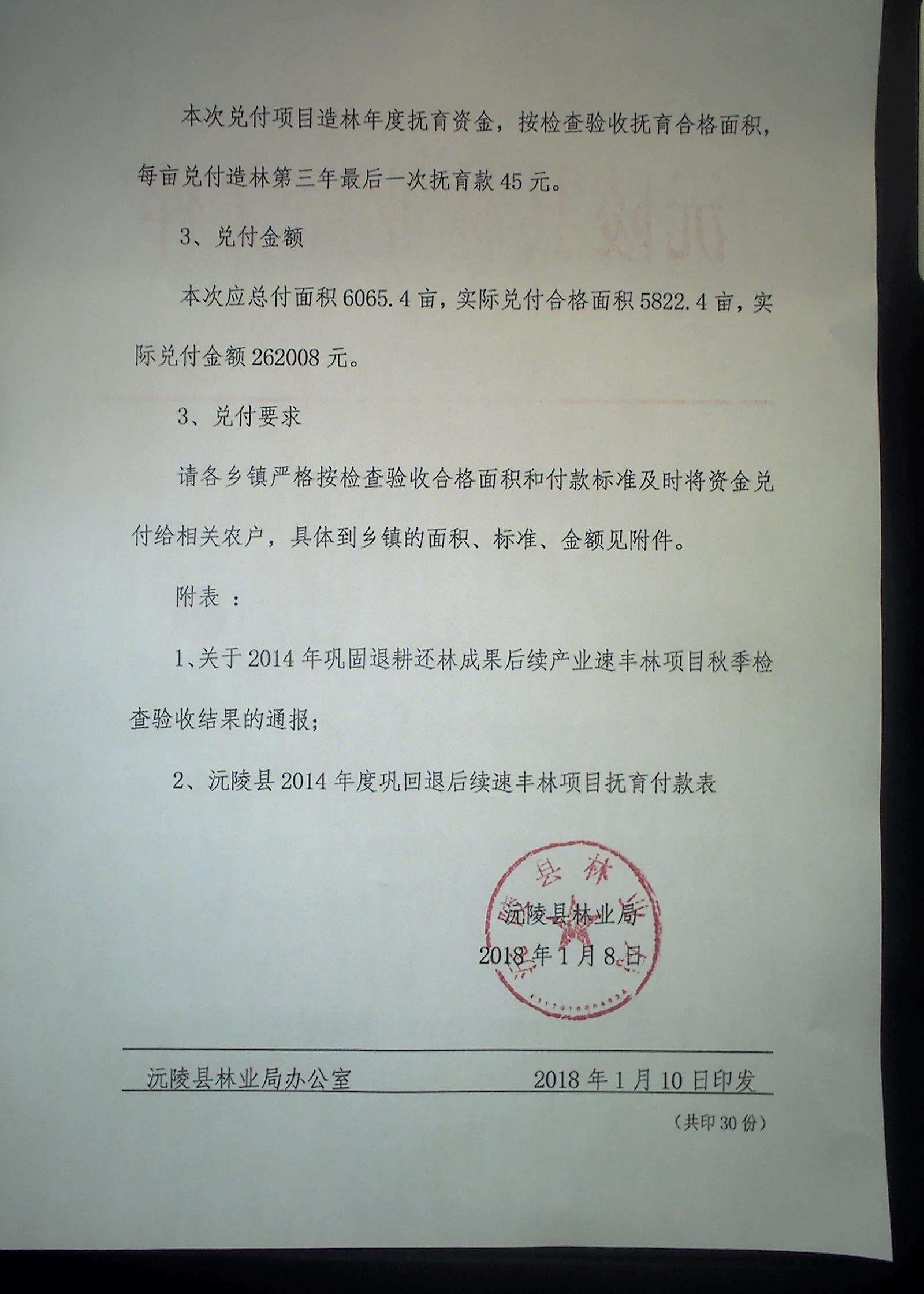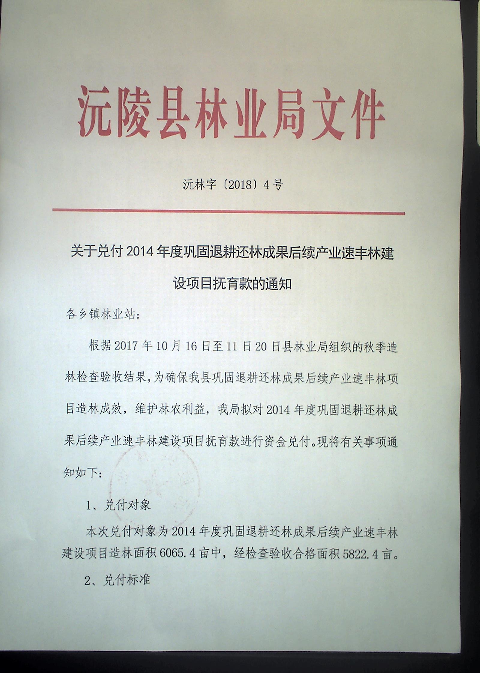 沅林字【2018】4号关于兑付2014年度巩固退耕还林成果后续产业速丰林建设项目抚育款的通知