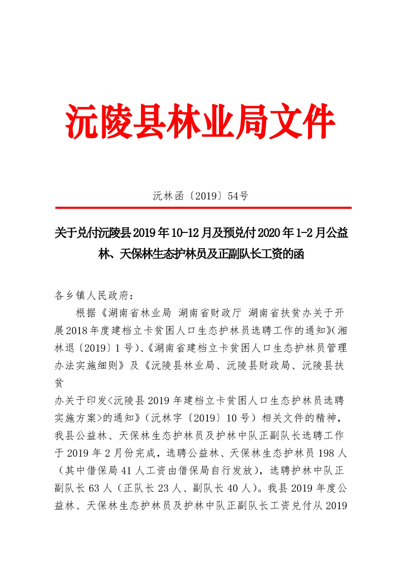 【2019】54号 关于兑付沅陵县2019年10-12月预兑付2020年1-2月公益林、天保林生态护林员及正副队长工资的函