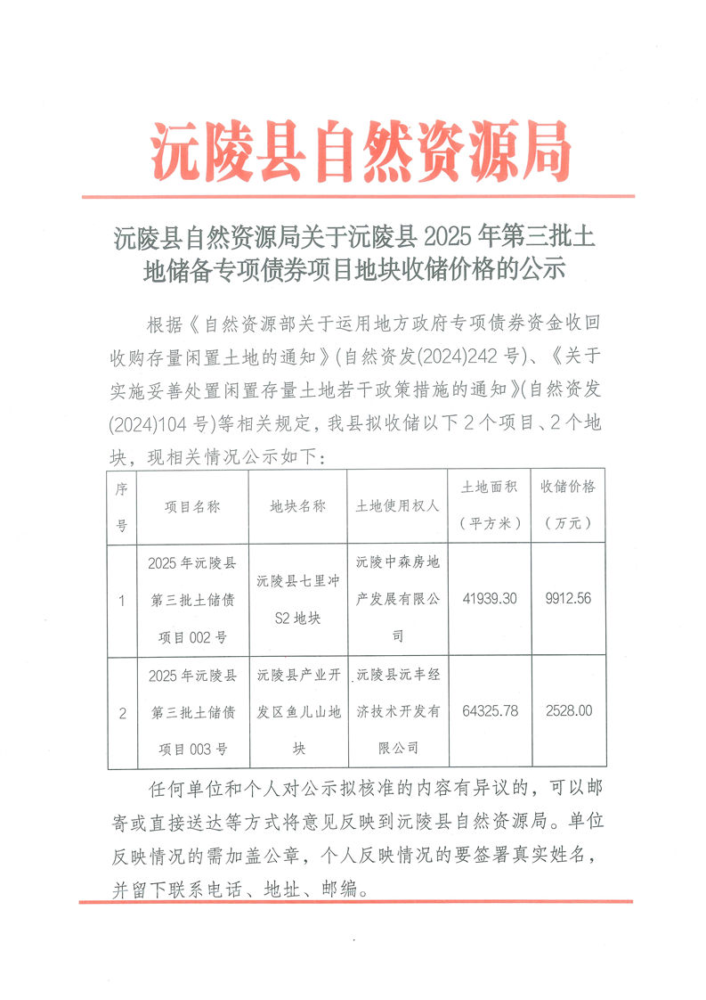 沅陵县自然资源局关于沅陵县2025年第三批土地储备专项债券项目地块收储价格的公示