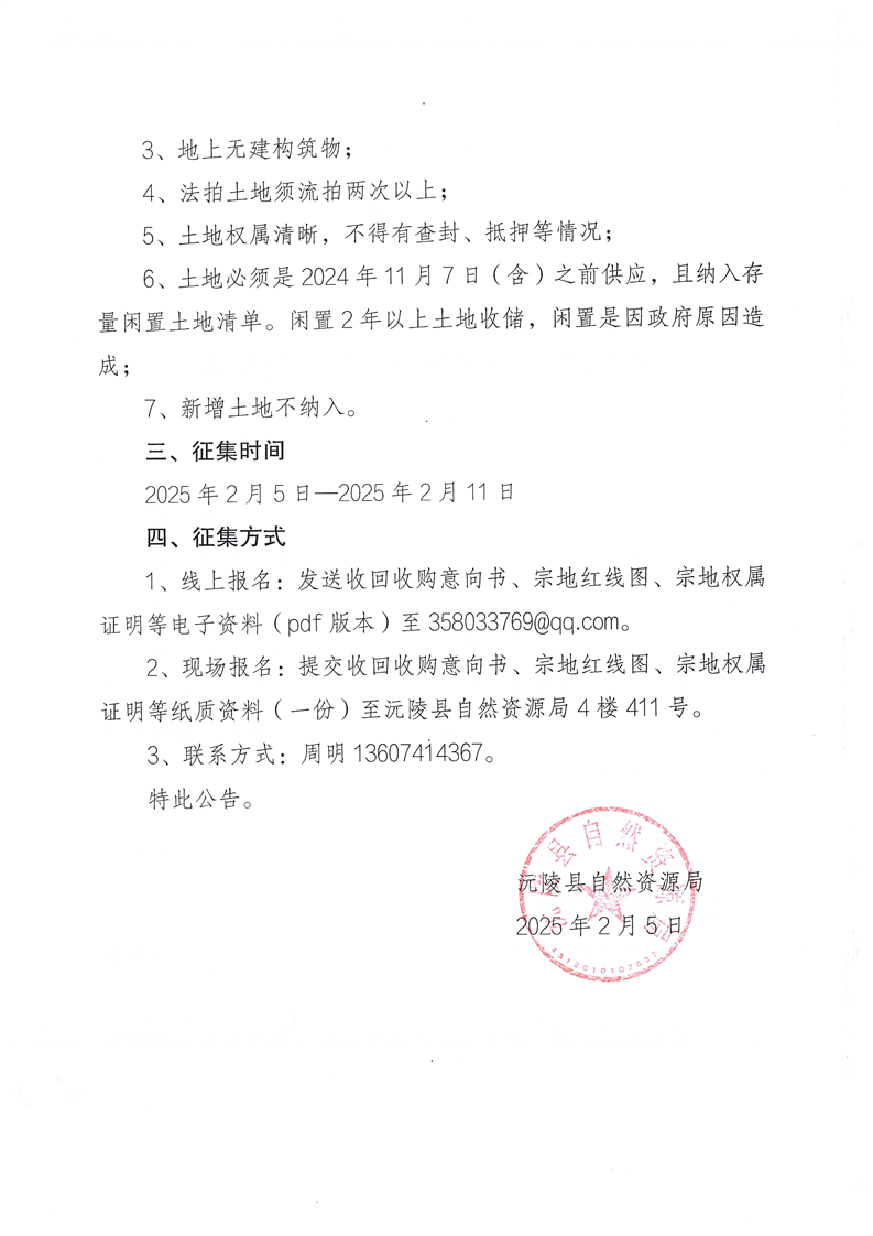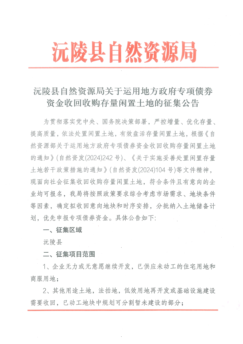 沅陵县自然资源局关于运用地方政府专项债券资金收回收购存量闲置土地的征集公告