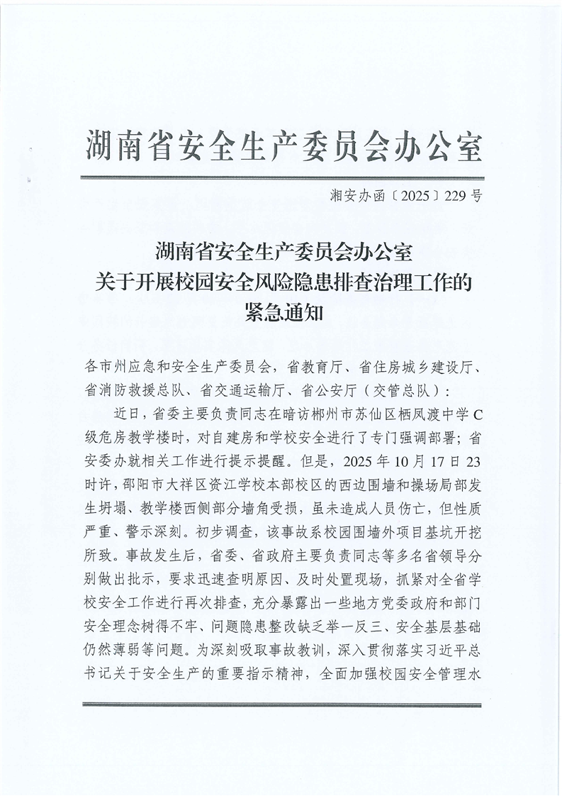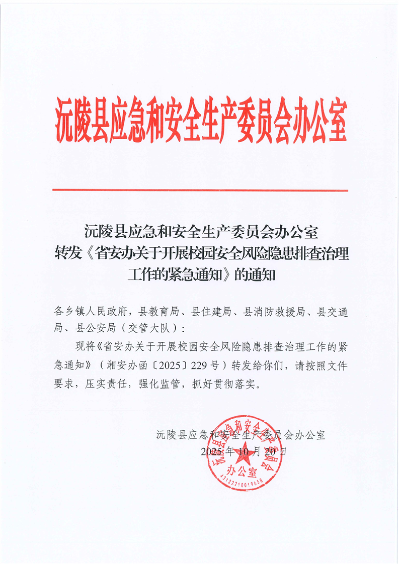 沅陵县应急和安全生产委员会办公室转发《省安关于开展校园安全风险隐患排查治理工作的紧急通知》的通知