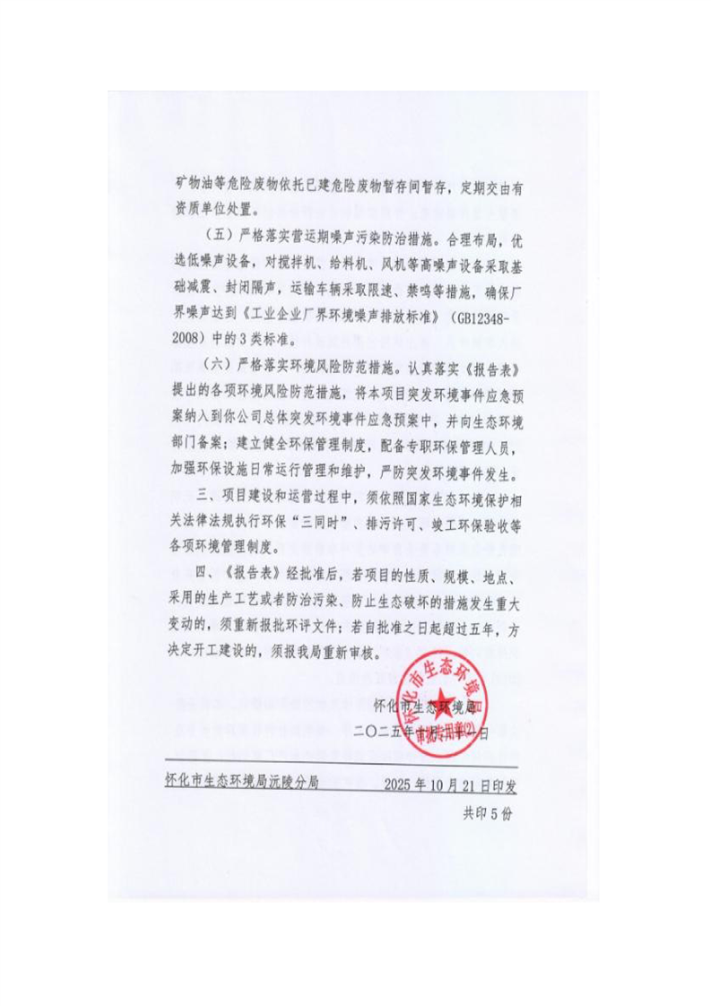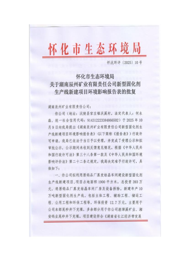 怀化市生态环境局关于湖南辰州矿业有限责任公司新型固化剂生产线新建项目环境影响报告表的批复