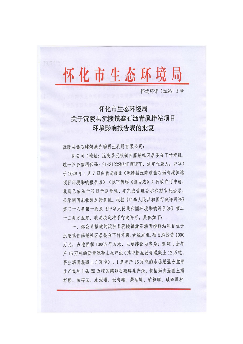 怀化市生态环境局关于沅陵县建筑垃圾资源化利用项目(一期)环境影响报告表的批复