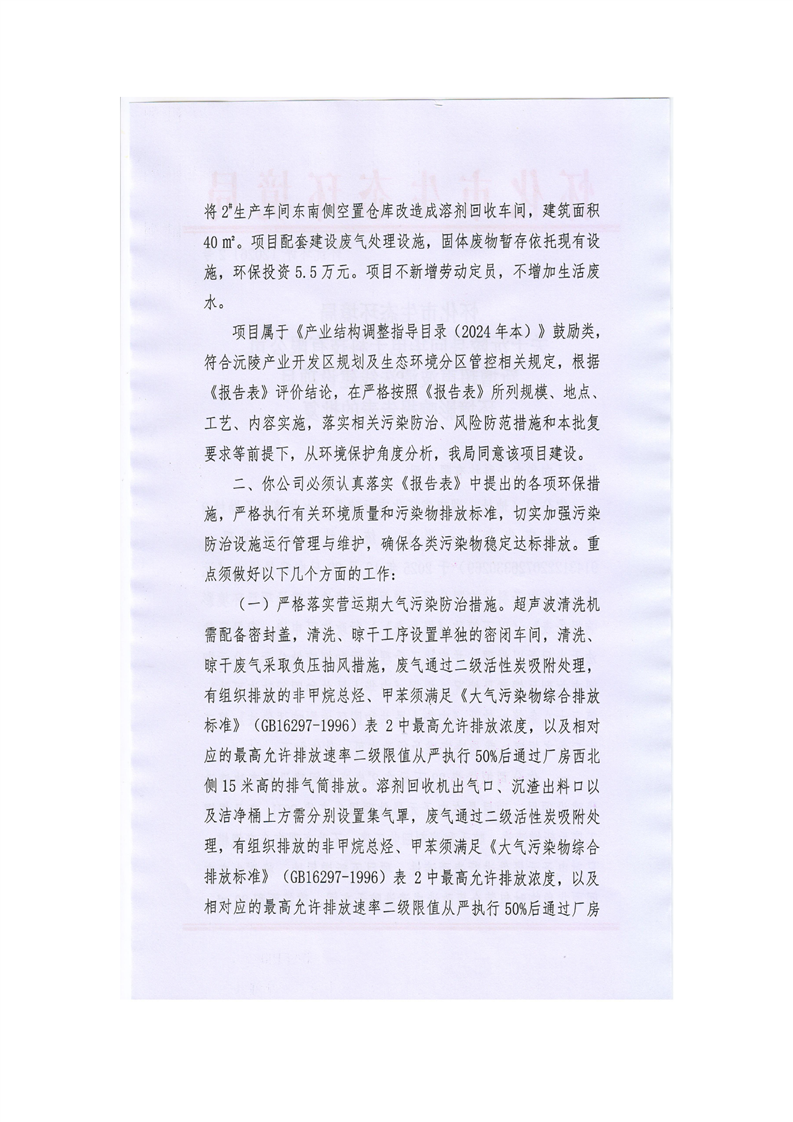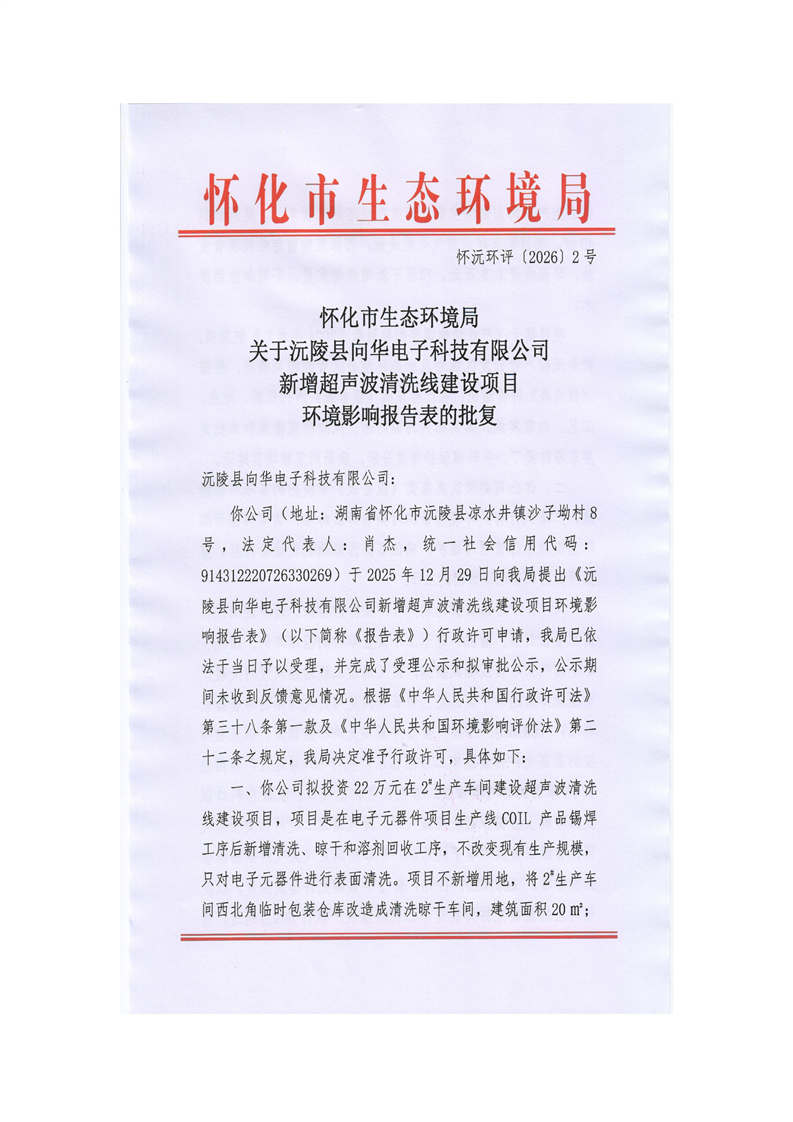 怀化市生态环境局关于沅陵县向华电子科技有限公司新增超声波清洗线建设项目环境影响报告表的批复