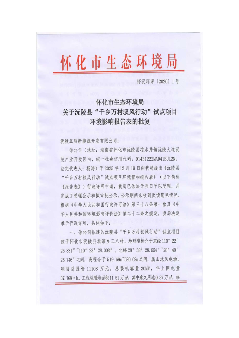 怀化市生态环境局关于沅陵县“千乡万村驭风行动”试点项目环境影响报告表的批复