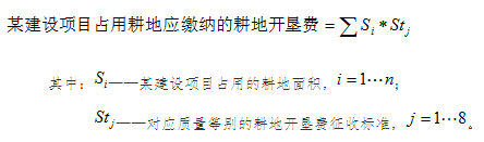 2、耕地开垦费征收额等于建设项目占用的耕地面积与所占耕地对应征收标准的乘积。对于建设项目占用耕地包含多种类型和质量等别的,分别计算并加总。计算公式为: