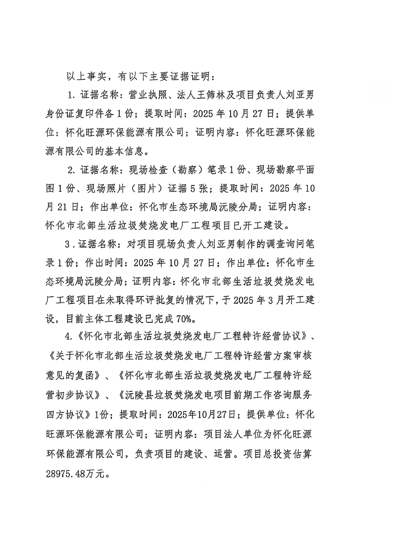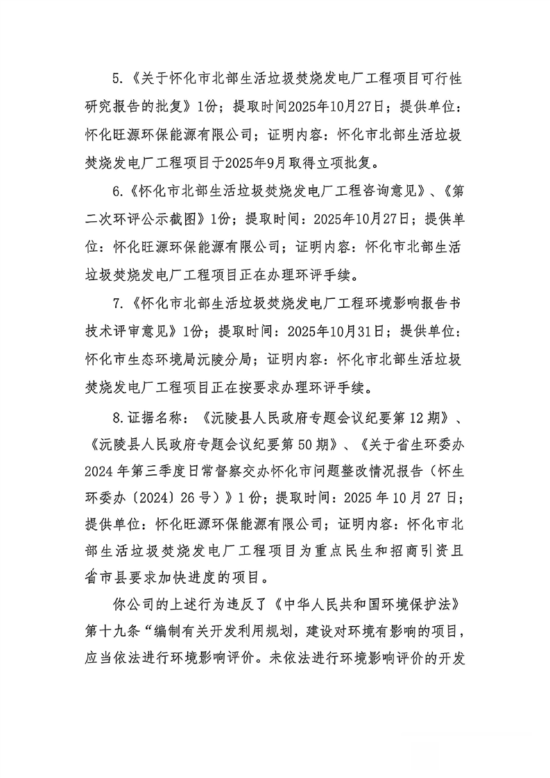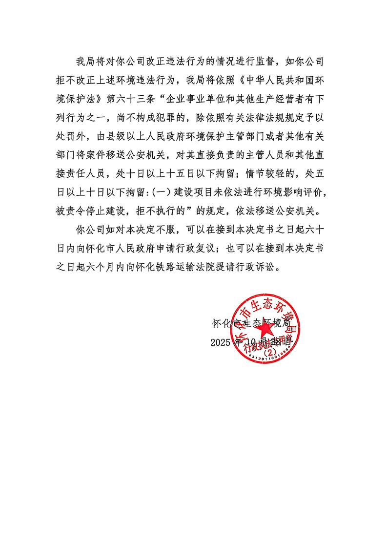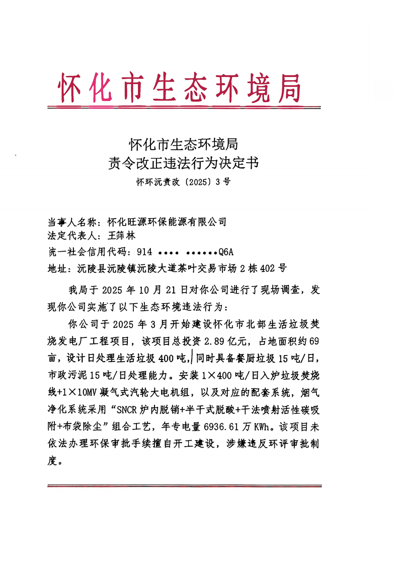 怀化市生态环境局责令改正违法行为决定书(怀化旺源环保能源有限公司)