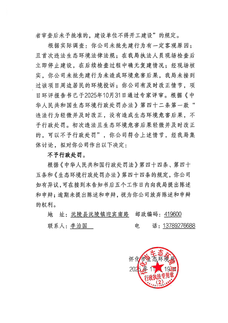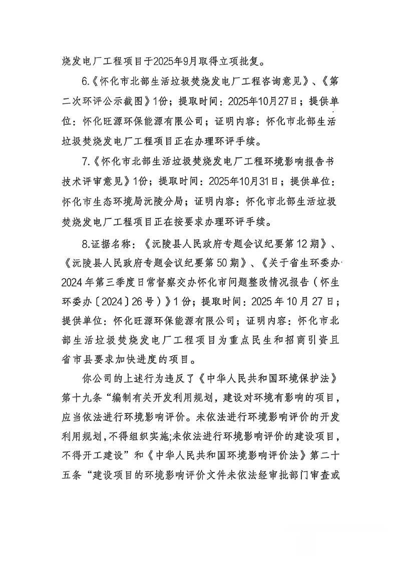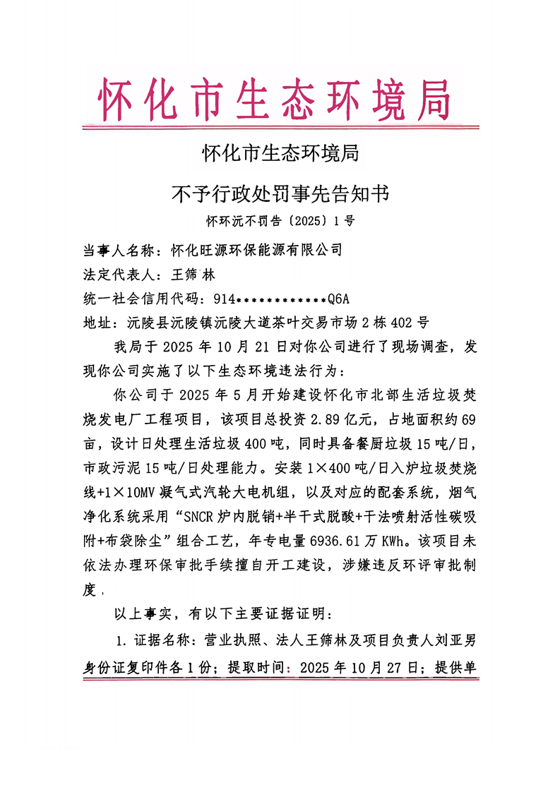 怀化市生态环境局不予行政处罚事先告知书(怀化旺源环保能源有限公司)