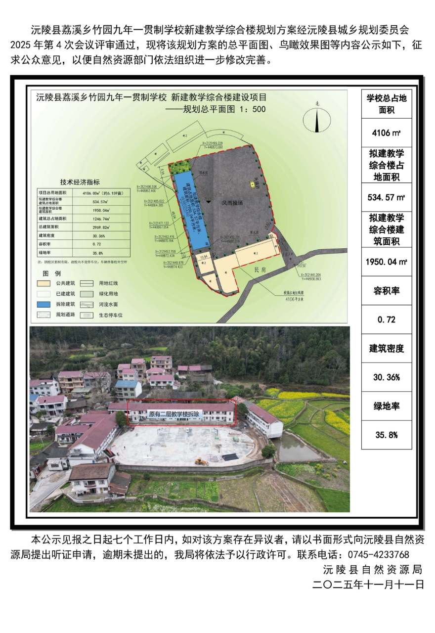 沅陵县荔溪乡竹园九年一贯制学校新建教学综合楼规划方案-批前公示