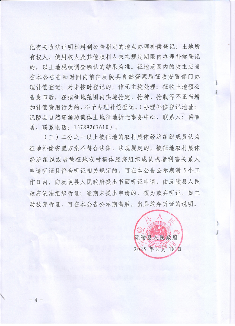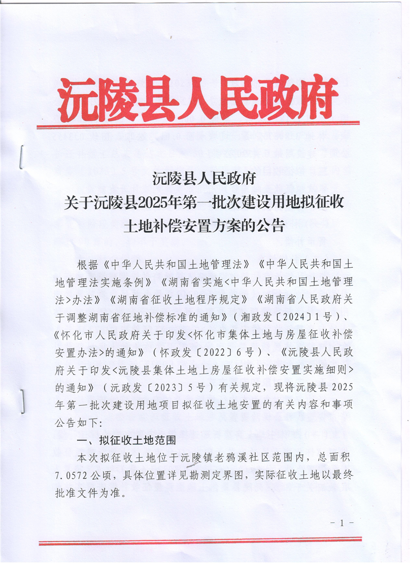 沅陵县人民政府关于沅陵县2025年第一批次建设用地拟征收土地补偿安置方案公告