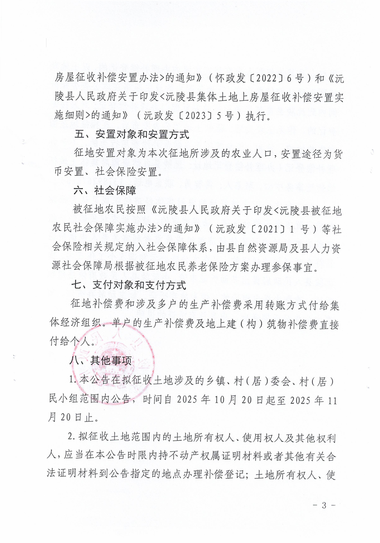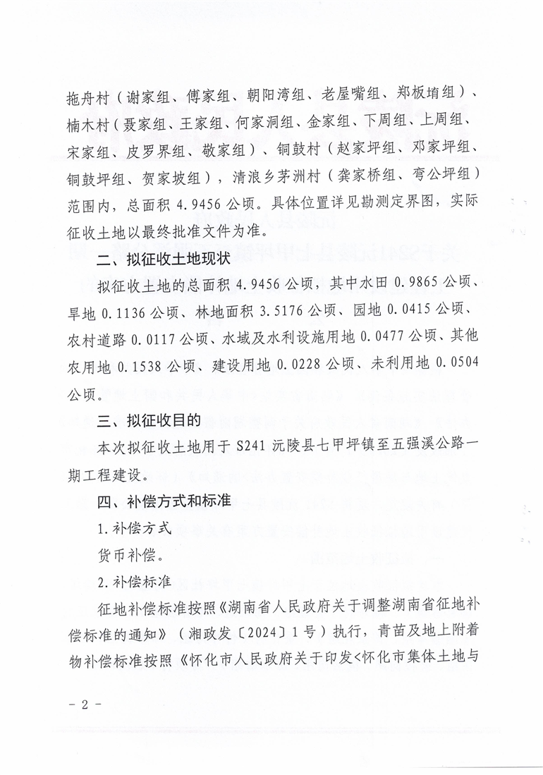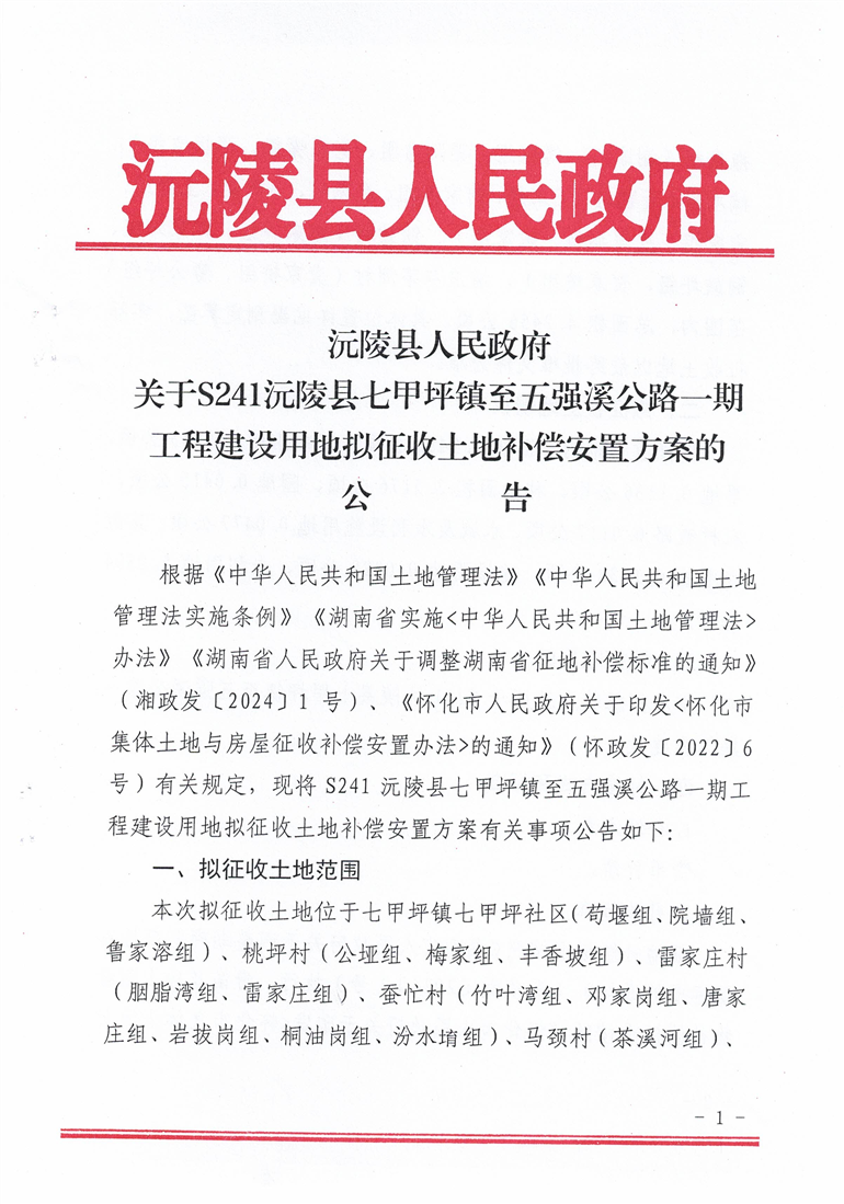 沅陵县人民政府关于S241沅陵县七甲坪镇至五强溪公路一期工程建设用地拟征收土地补偿安置方案的公告