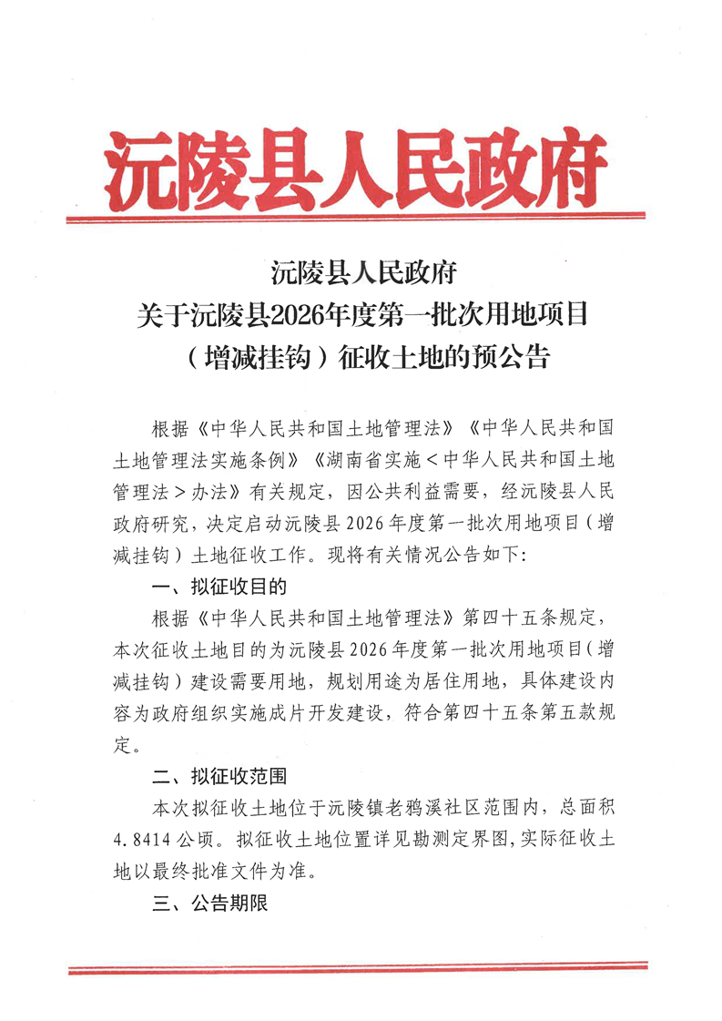 沅陵县人民政府关于沅陵县2026年度第一批次用地项目(增减挂钩)征收土地预公告