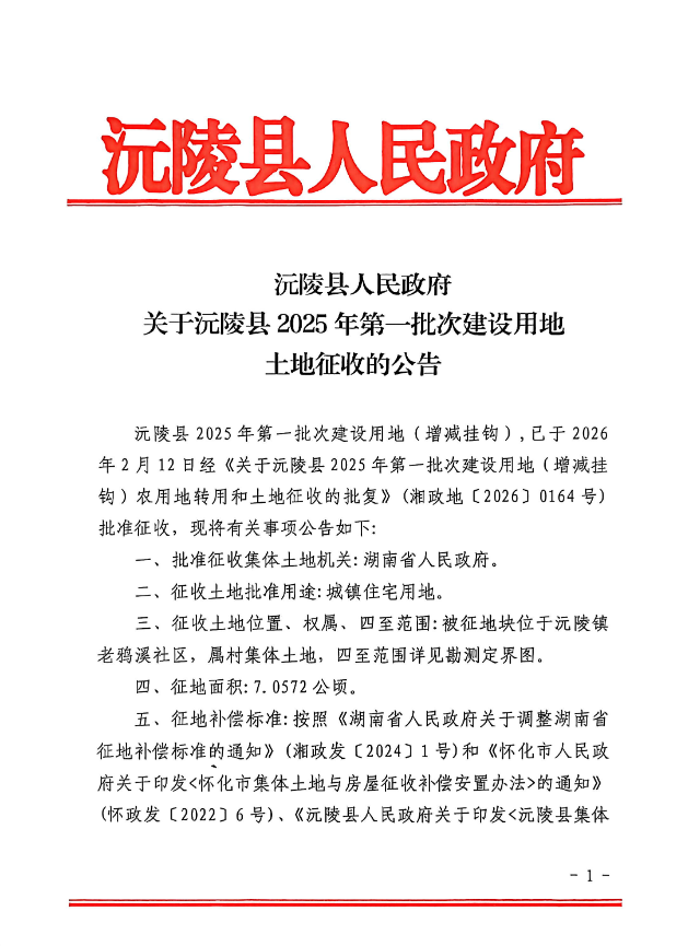 沅陵县人民政府关于沅陵县2025年第一批次建设用地土地征收的公告