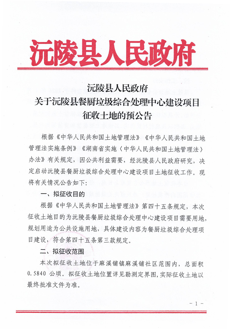 沅陵县人民政府关于沅陵县餐厨垃圾综合处理中心建设项目征收土地预公告