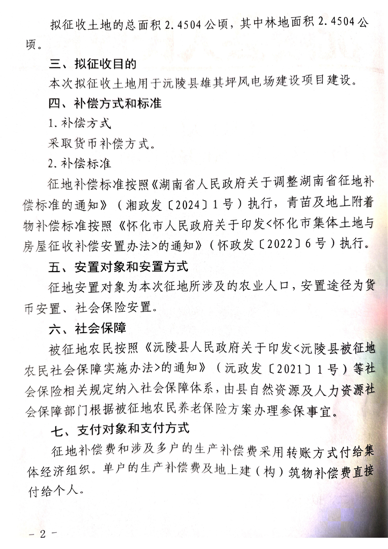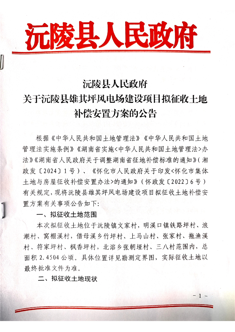 沅陵县人民政府关于沅陵县雄其坪风电场建设项目拟征收土地补偿安置方案公告