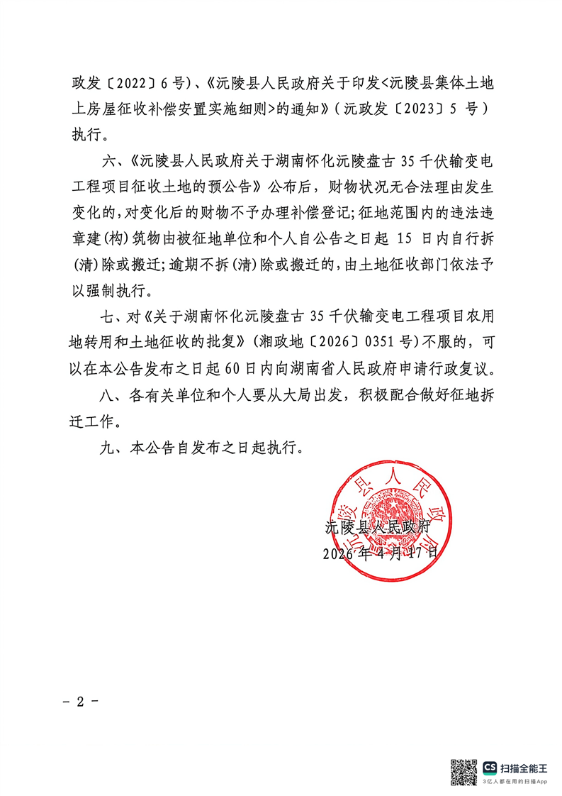 沅陵县人民政府关于沅陵县盘古35千伏输变电工程项目土地征收的公告