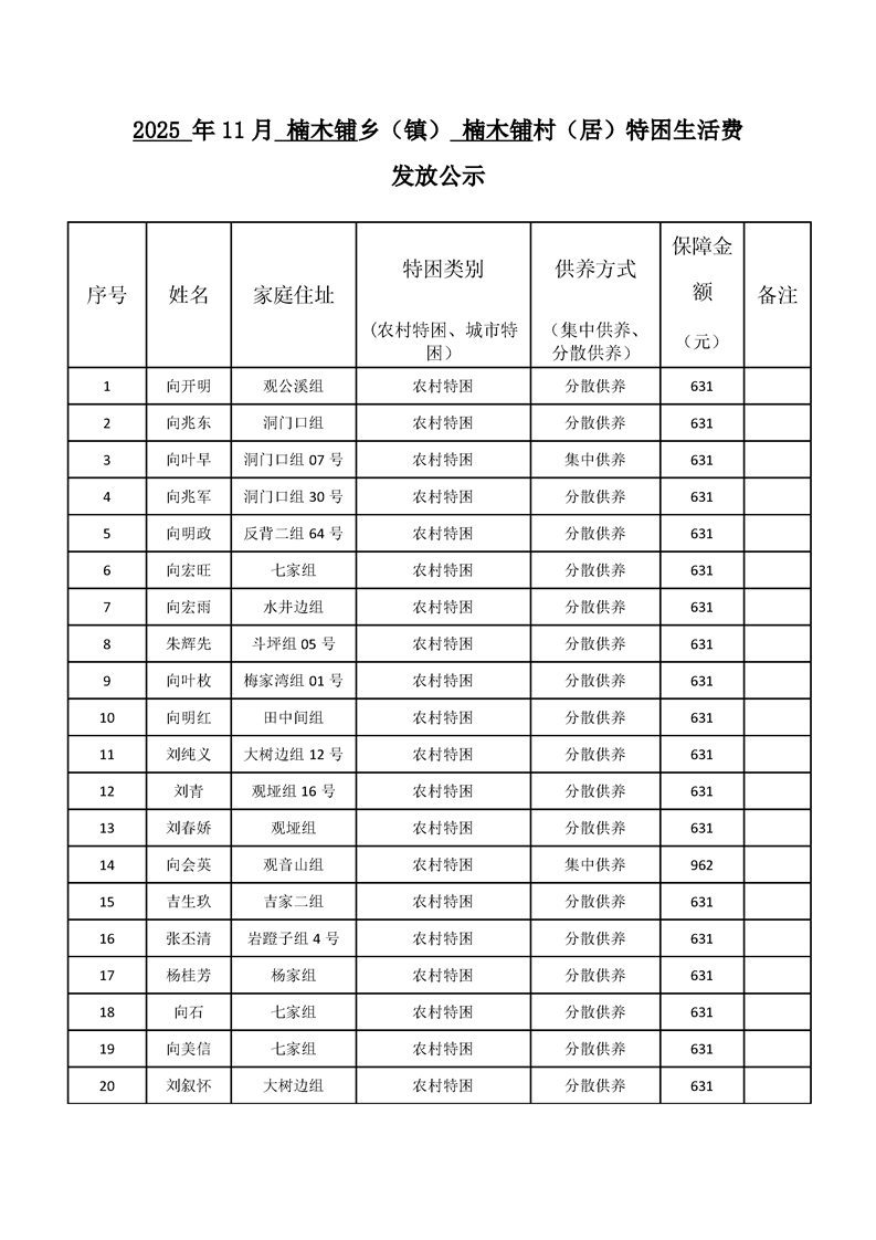 【社会救助】2025年11月楠木铺乡楠木铺村特困生活费发放公示