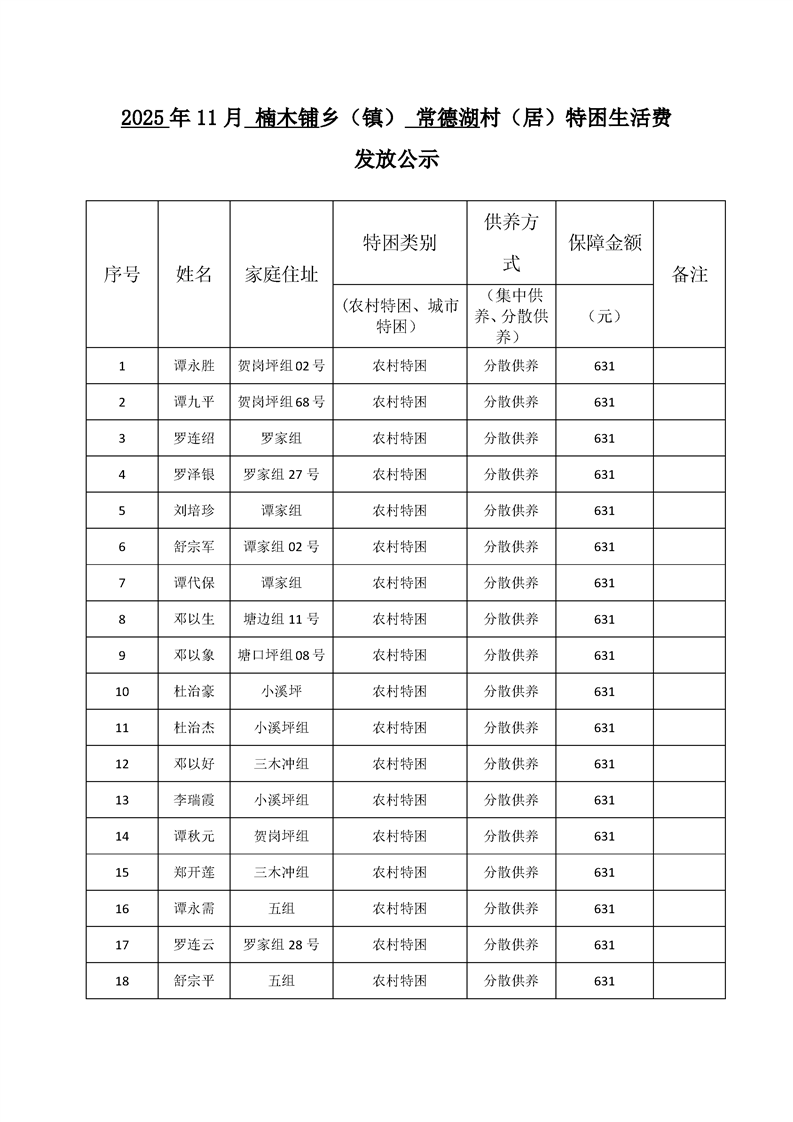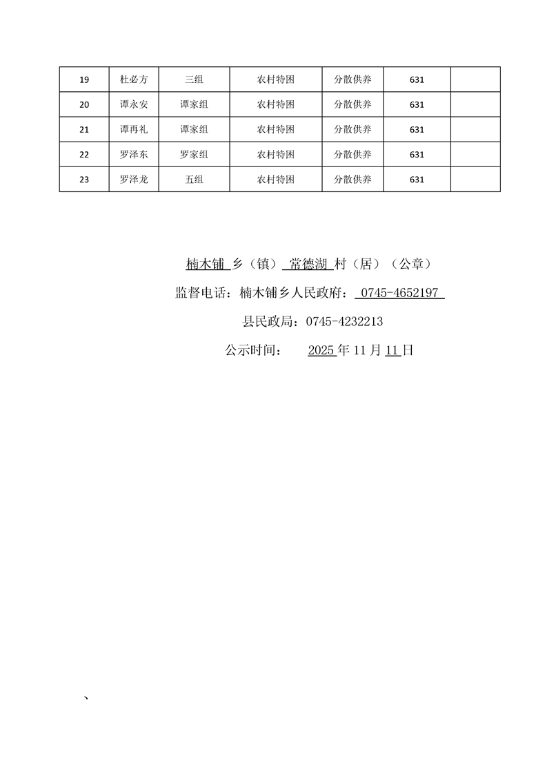 【社会救助】2025年11月楠木铺乡常德湖村特困生活费发放公示