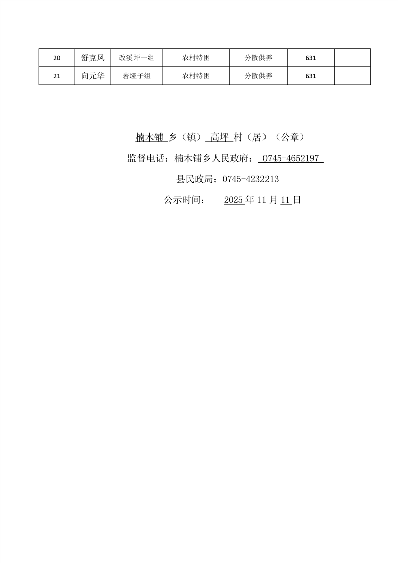 【社会救助】2025年11月楠木铺乡高坪村特困生活费发放公示