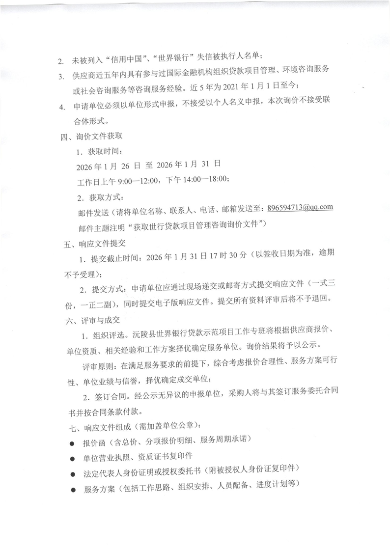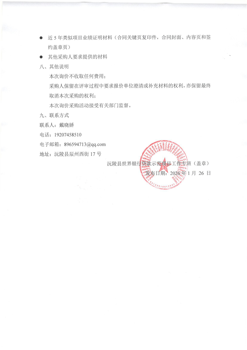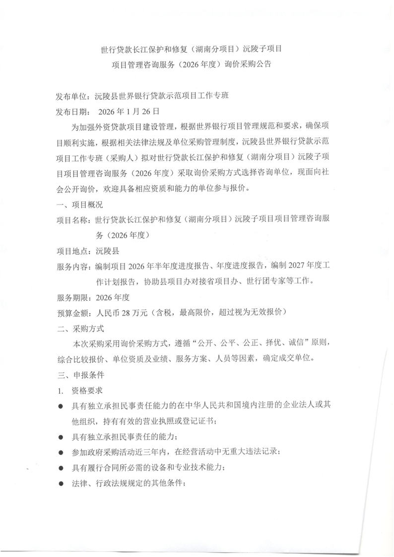 世行贷款长江保护和修复(湖南分项目)沅陵子项目项目管理咨询服务(2026年度)询价采购公告