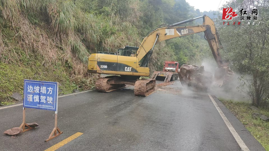 张沅公路是通往借母溪景区及张家界市的重要通道,直接关系到群众出行安全。养护巡查人员对现场立即设置警示标志,经现场勘查,由于岩体巨大、质地坚硬,机械破拆耗时较长,加之正值清明假期,返乡车辆增多。现场负责人就近调集挖机1台,临时对道路进行封闭,进行紧张施工排险作业。当天下午13时30分,巨石被成功推出路面,隐患得以消除,车辆安全通行。