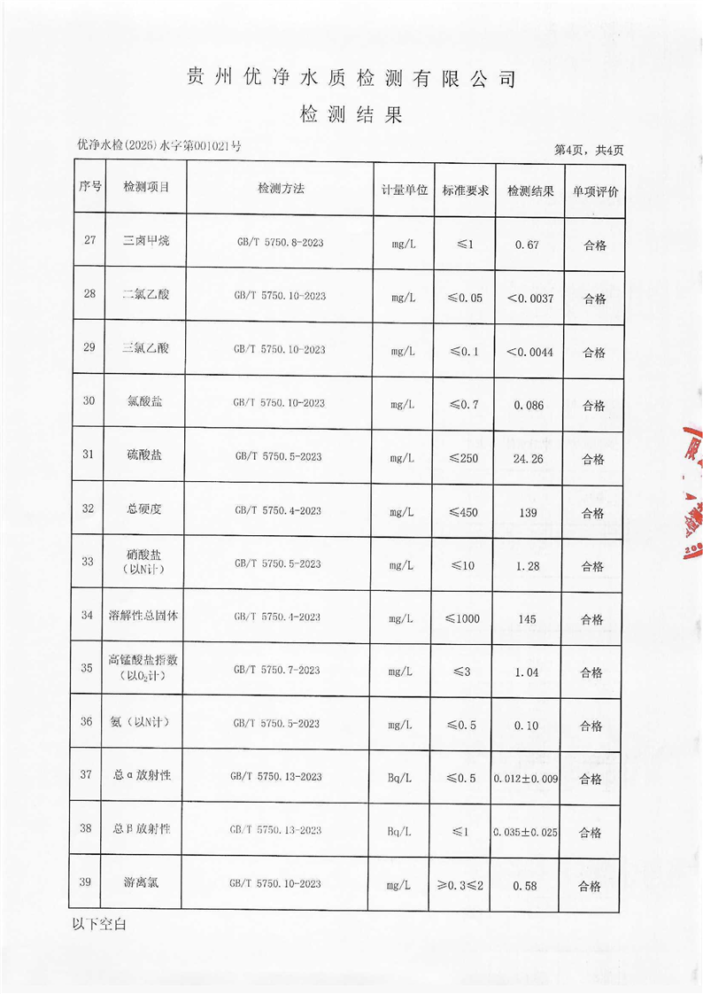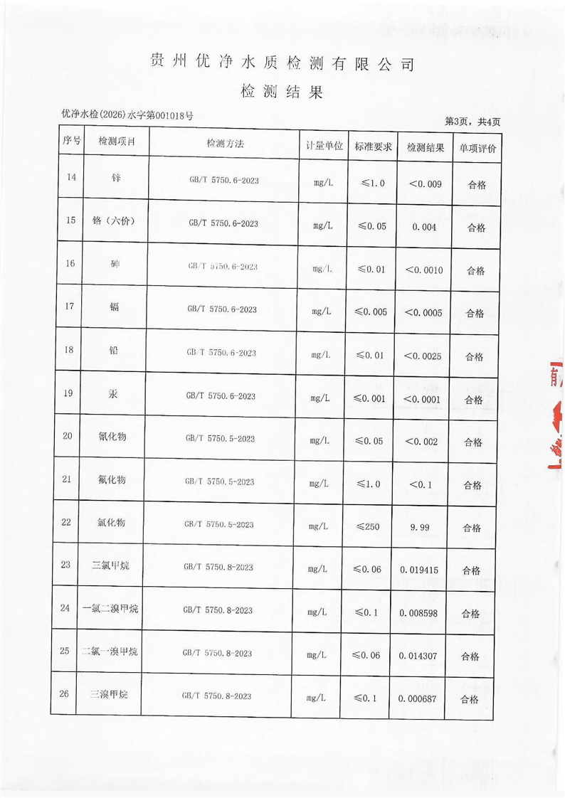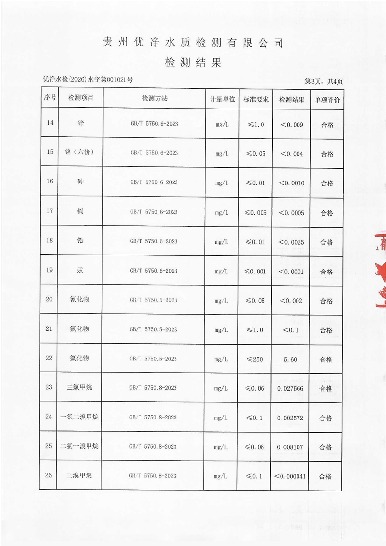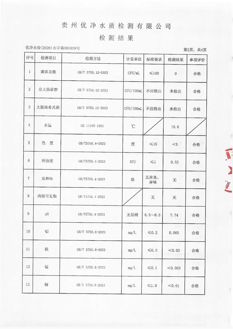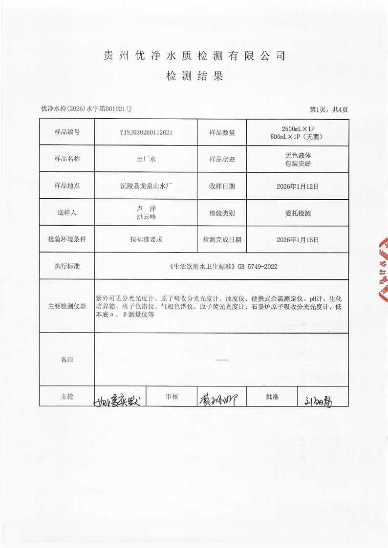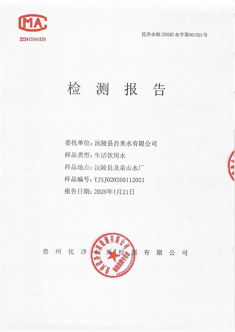 沅陵县自来水有限公司2026年1月生活饮用水检测报告