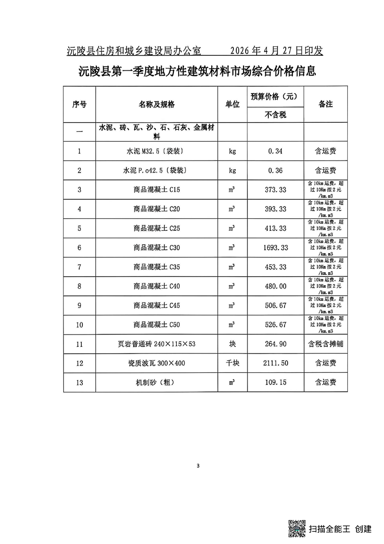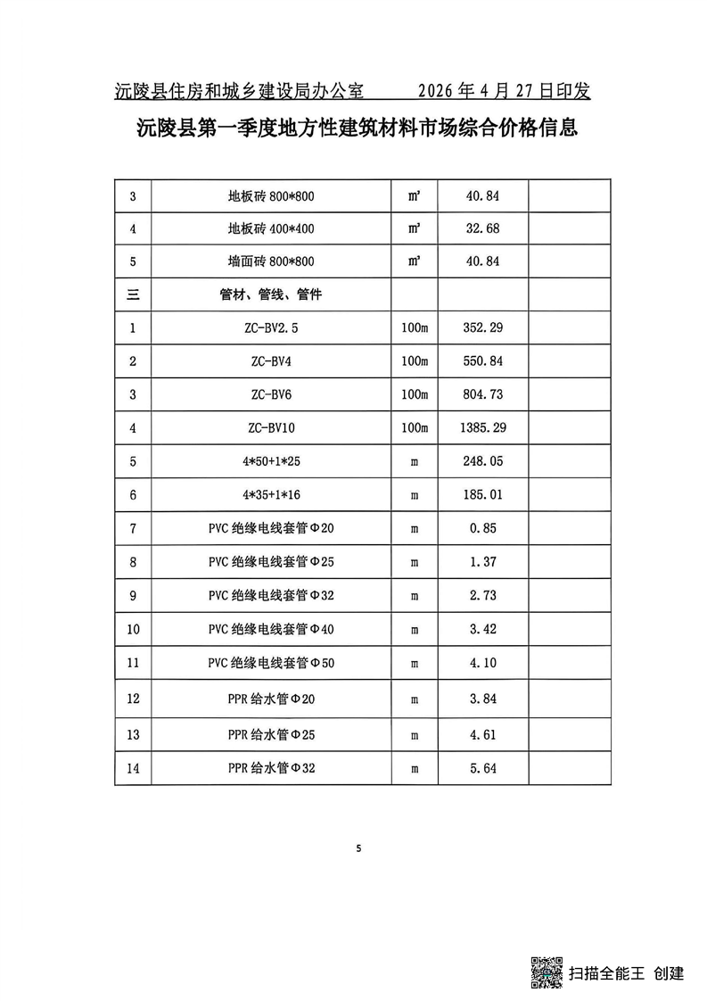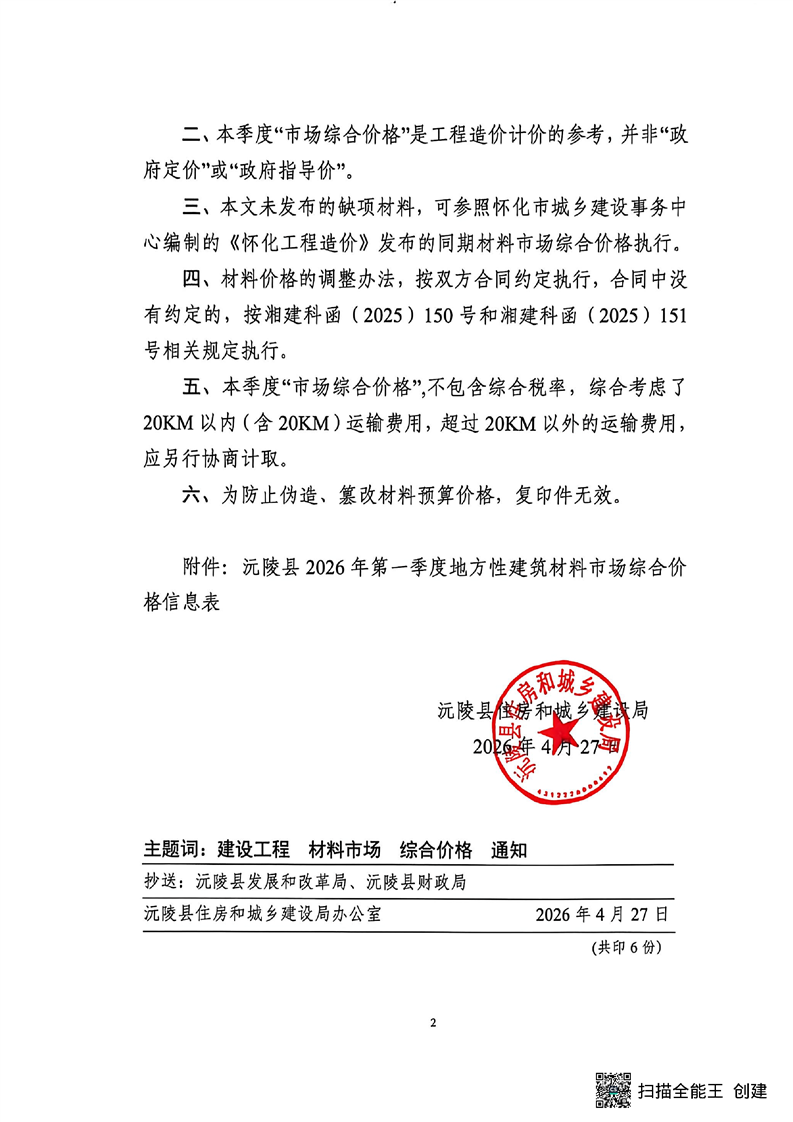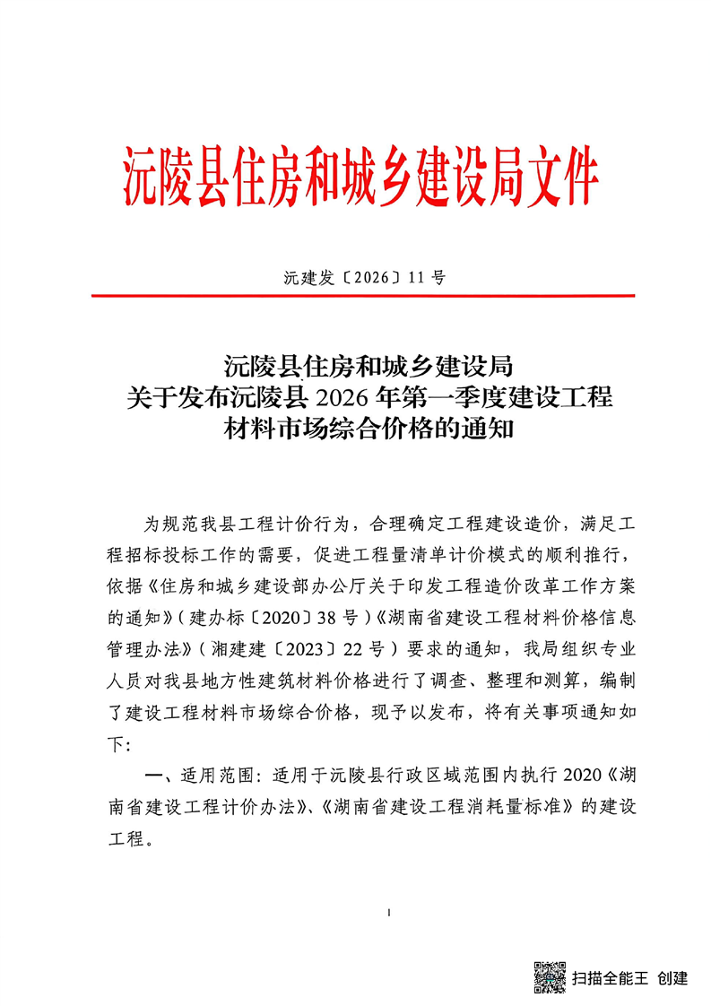沅陵县住房和城乡建设局关于发布沅陵县2026年第一季度建设工程材料市场综合价格的通知