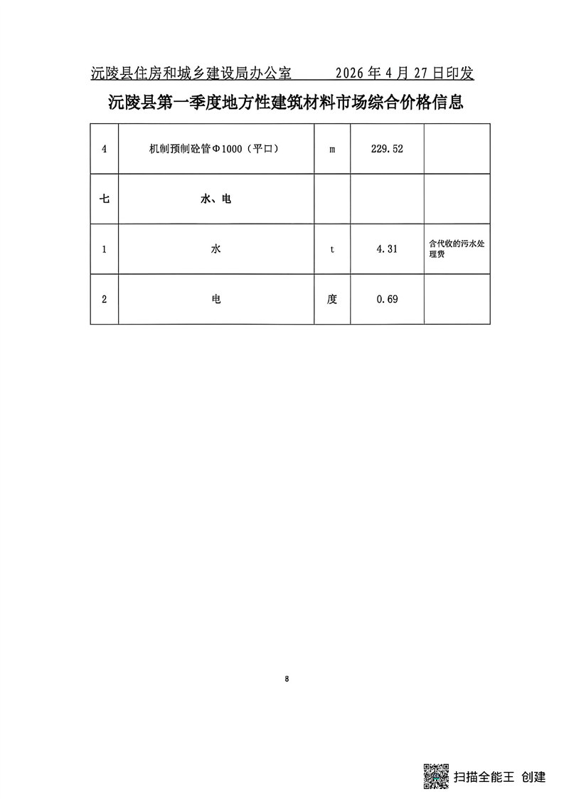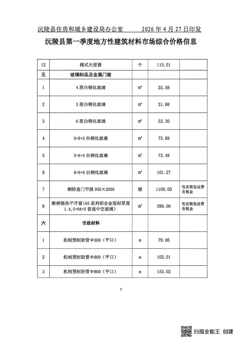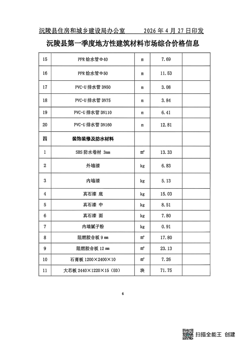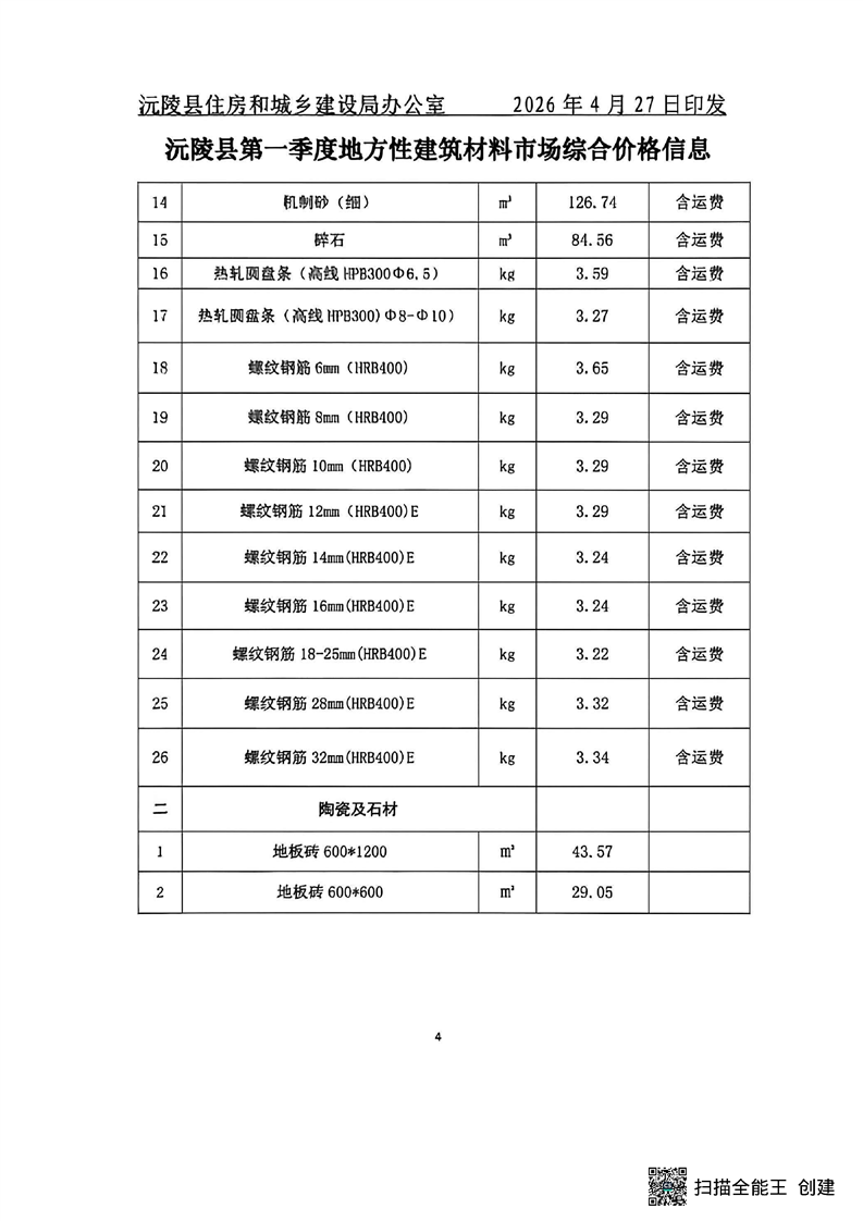 沅陵县住房和城乡建设局关于发布沅陵县2026年第一季度建设工程材料市场综合价格的通知