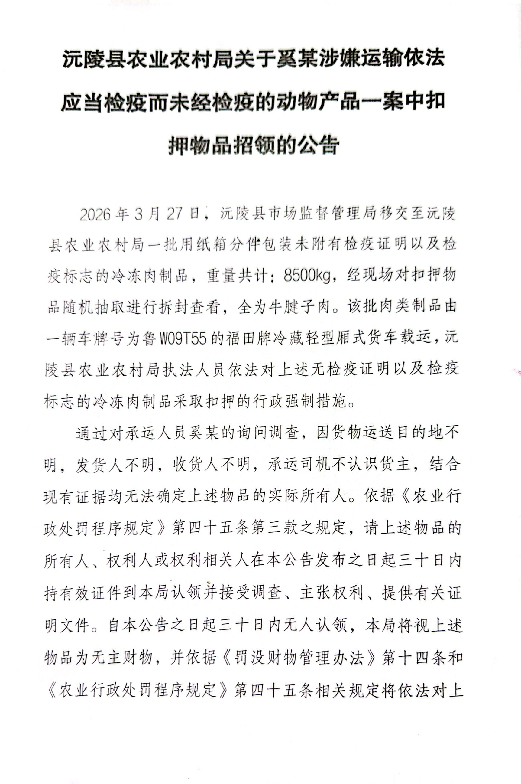 沅陵县农业农村局关于奚某涉嫌运输依法应当检疫而未经检疫的动物产品一案中扣押物品招领的公告